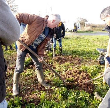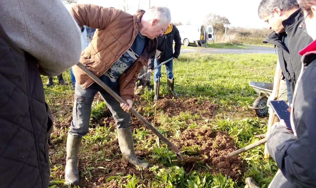 Benoît Huntzinger (à droite) et des bénévoles de l’association Horizon Bocage et des associations pour le maintien d’une agriculture paysanne (Amap) de Bouchemaine, près d’Angers, et de Cholet, ont planté 100 porte-greffes en une matinée, samedi 25 novembre.