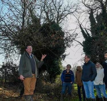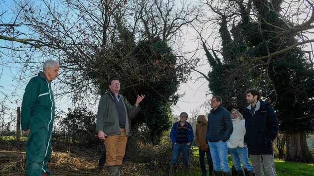 Chemillé-en-Anjou, le 6 février 2024. Benoît Huntzinger (au centre) présente ses châtaigniers séculaires à l’expert venu de Dordogne, Philippe Ménard (à gauche) et aux stagiaires intéressés par la renaissance du marron noir. | PHOTO CO - LAURENT COMBET